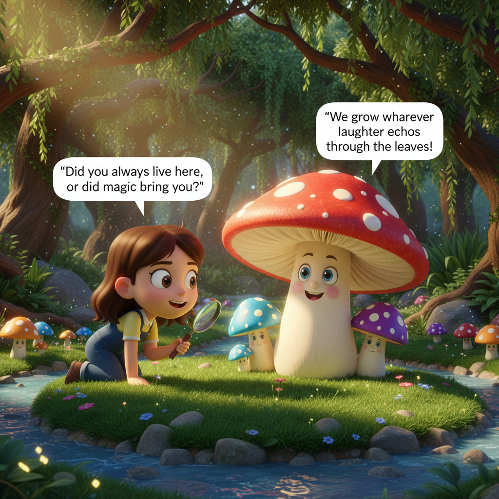The enchanted forest is portrayed with repetitive yet evolving elements – whether it's the magical glow of dewdrops or the smiling mushrooms that dot the path. These details ensure that every panel feels like a part of a larger, cohesive world.